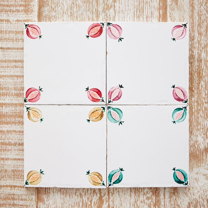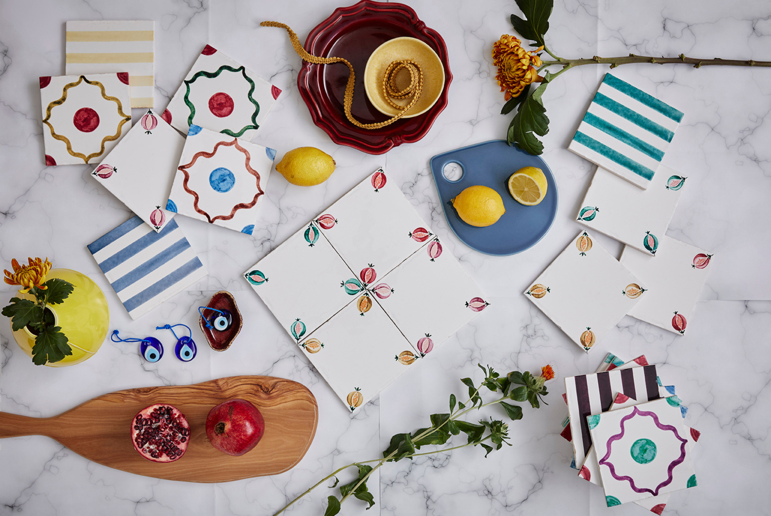 At the heart of this collection is the pomegranate —a symbol of fertility, abundance, and good fortune. Growing up, pomegranates were ever-present in my life, both in the dishes we shared and in the objects that adorned our home. A full wall of Pomegranates and Beirut Tiles celebrates Lebanon’s love for bold, rhythmic pattern and brings a touch of the Orient into your space.