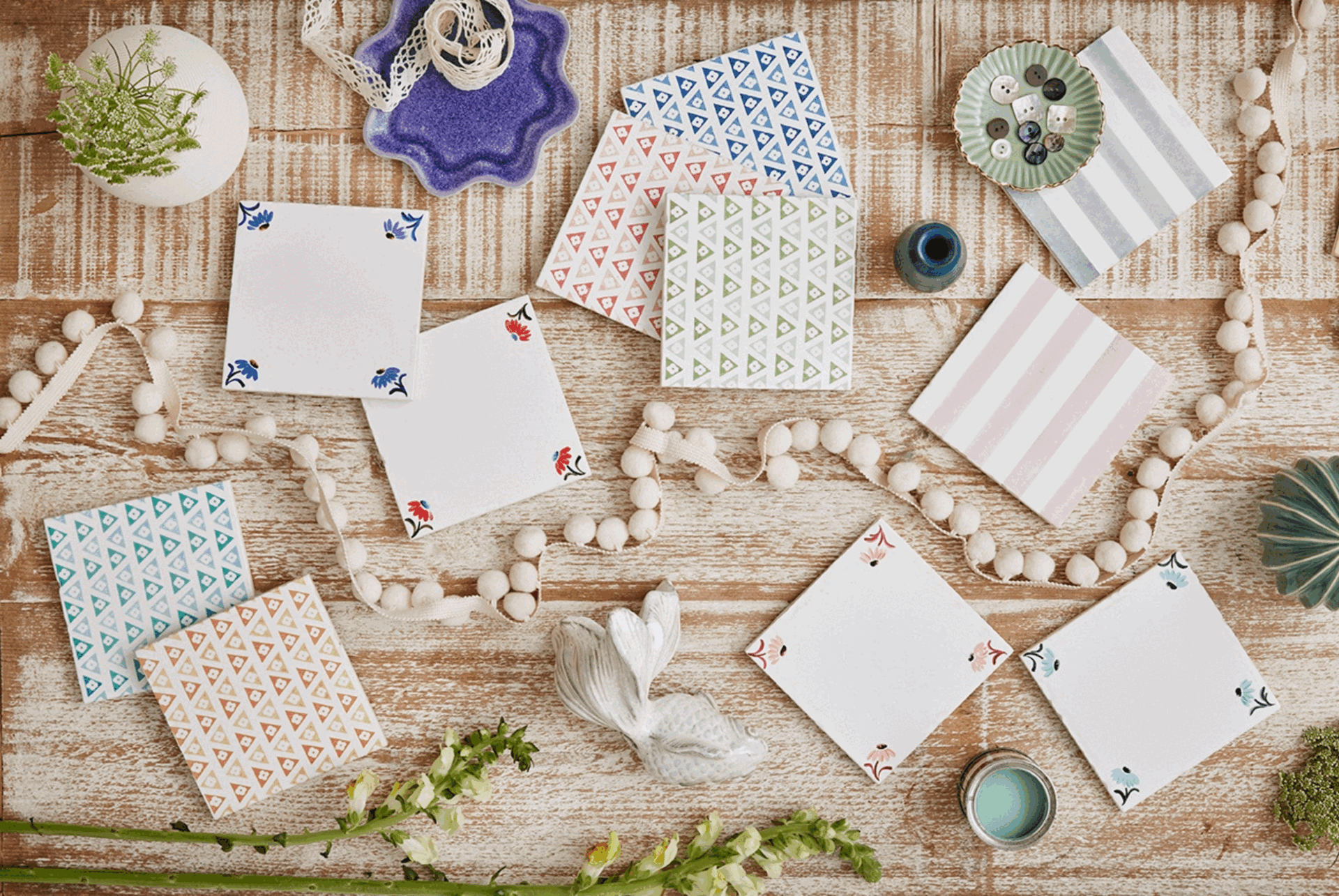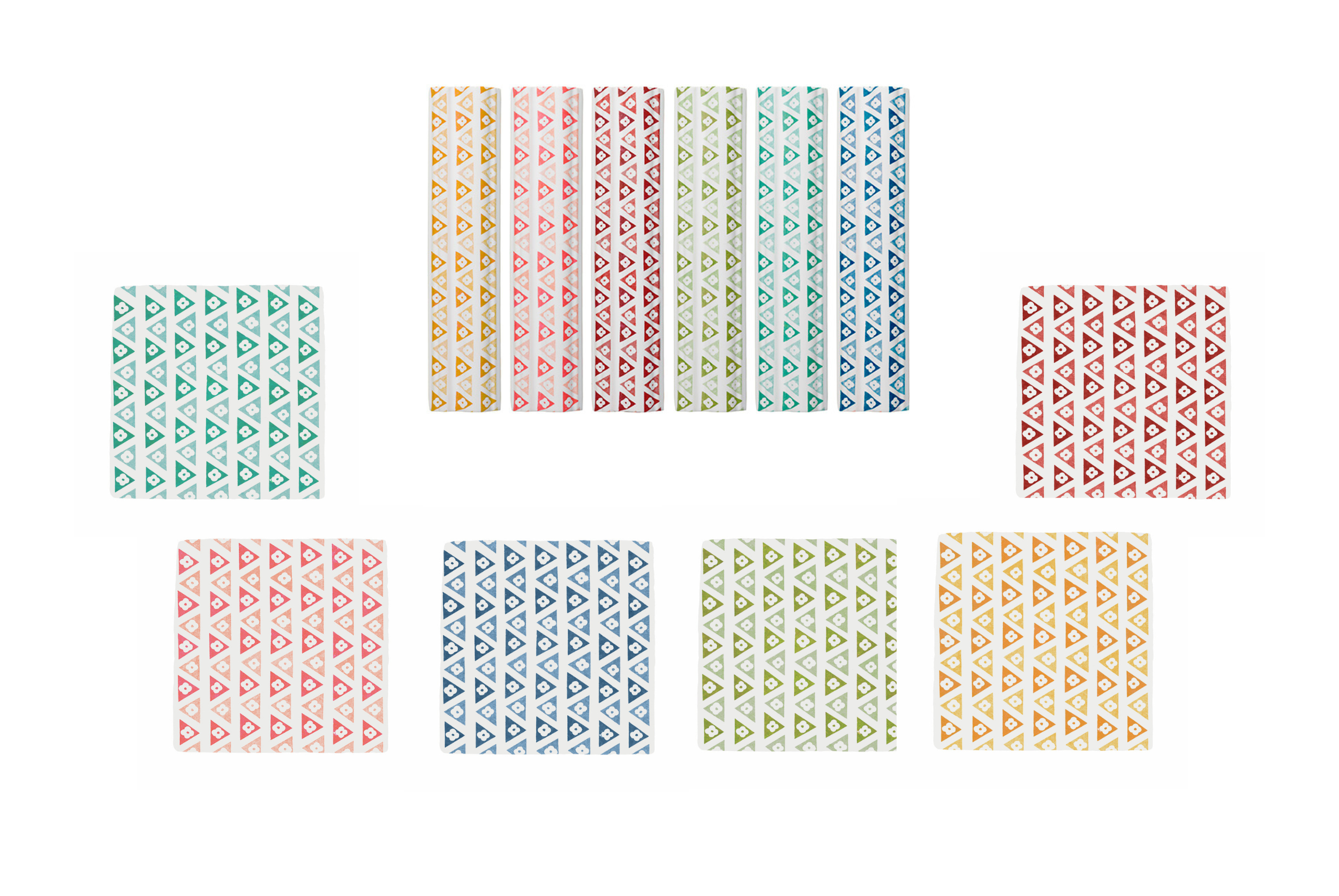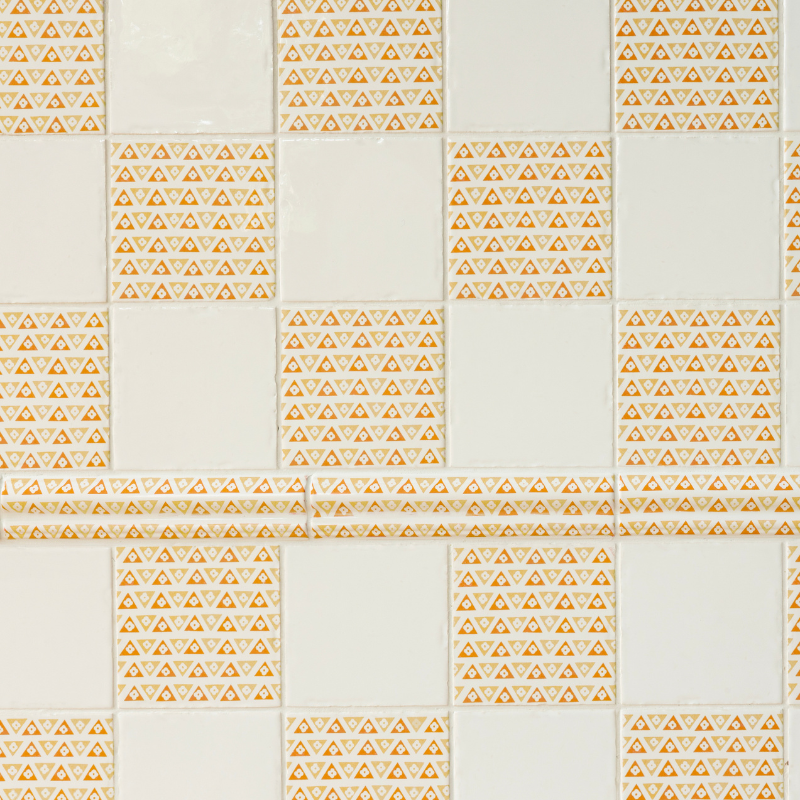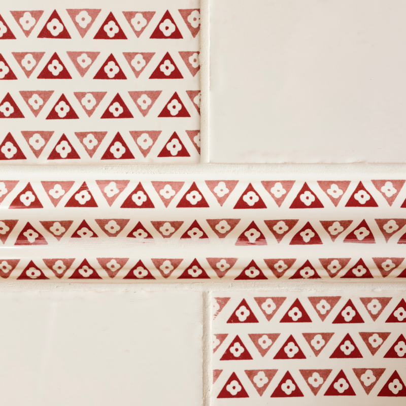 Designed by Petra and proudly crafted in Britain, our Cosmo Collection of Tiles and Dado Trims features a captivating geometric pattern. Rows of colourful triangles interlock seamlessly, each adorned with a simple white flower at its centre. The alternating tonal shades create a striking, visually dynamic effect, offering a bold yet balanced aesthetic for any space.