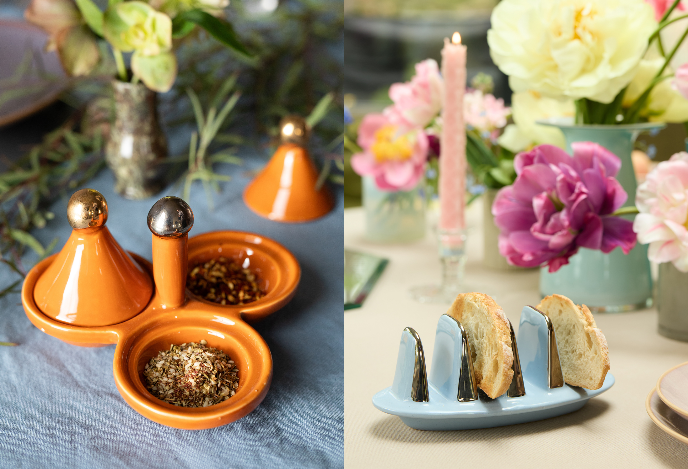 The Butter Dish is designed with clean lines and gold lustre finial — an heirloom piece to bring to the table day after day. The Toast Rack adds a hint of nostalgia, reimagined through Petra’s signature lens of colour and form with chrome highlights. And the Condiments Caddy, with its curved dividers and thoughtful handle, transforms simple organisation into something quietly delightful.