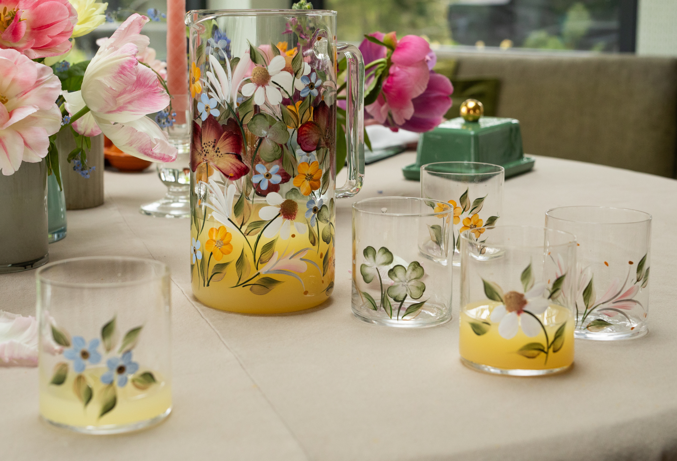 The collection draws inspiration from the colours of the Scotland — soft moss greens, gentle heather pinks, and earthy neutrals that echo the landscape surrounding Petra’s home. That sense of place continues through our hand-painted Highland Wildflowers Jugs and Crystal Tumblers, each adorned with meadow blooms that grow just beyond the studio windows. They sit beautifully alongside the new ceramics, creating a complete tabletop story of texture, colour, and joy.
