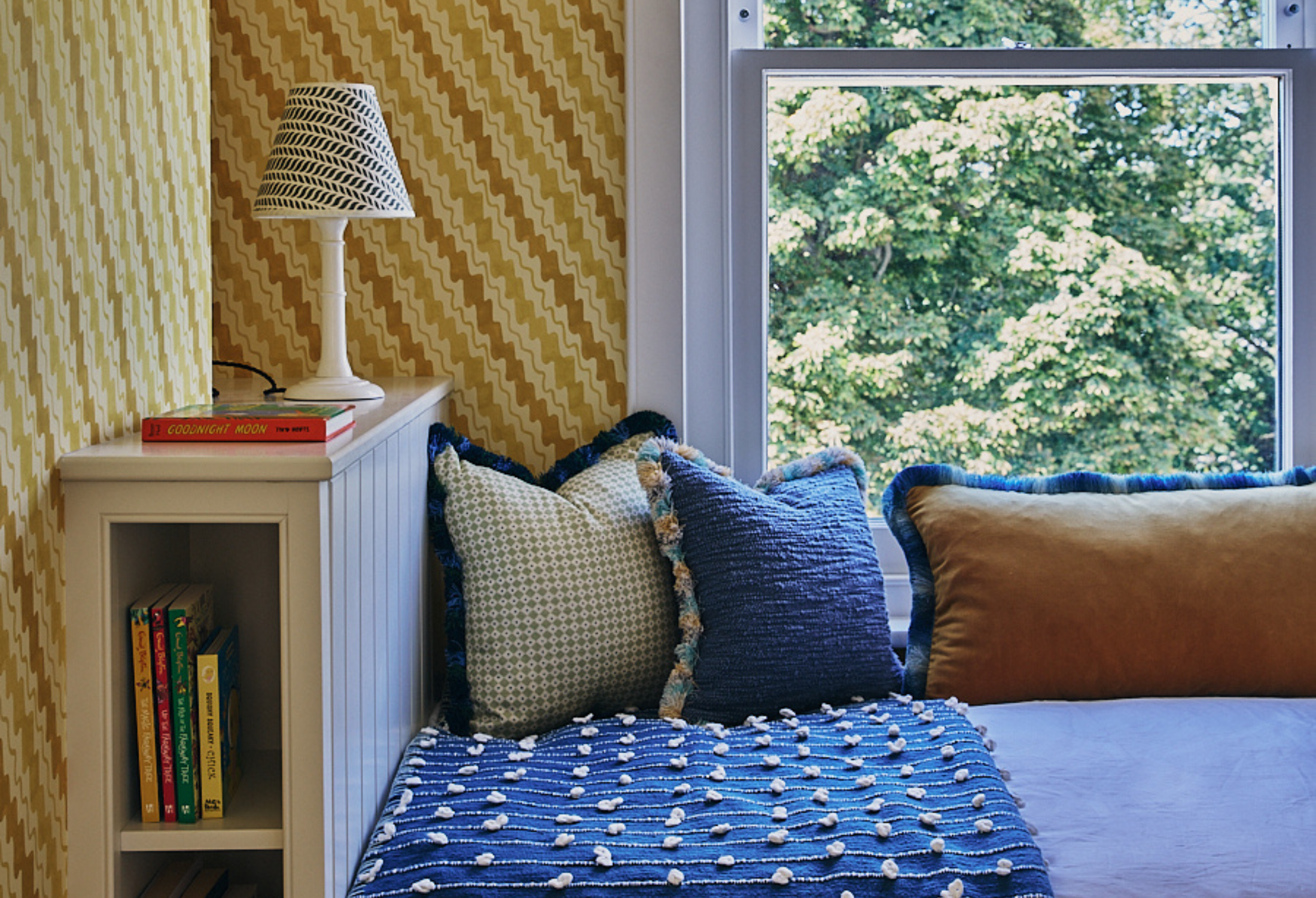 I always find it’s easy to layer textiles and patterns in smaller spaces which is why this room lends itself really well to the concept. We decided to add multiple cushions on the bed in order to incorporate every favourite fabric and added contrast fringing to give further punch.