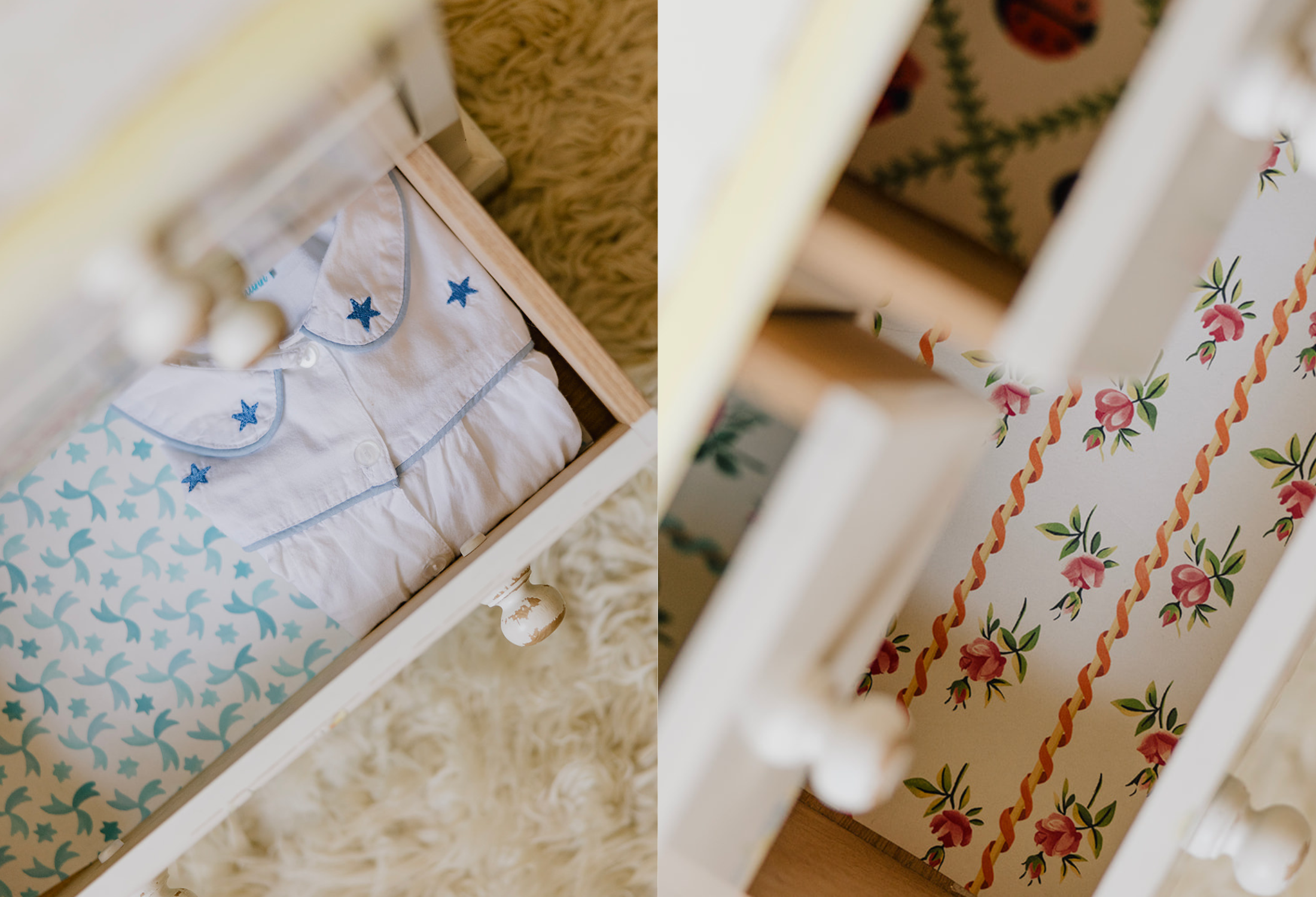 Using leftover wallpaper to update your drawers adds style, protects surfaces, and gives scraps a second life in an eco-friendly way. Petra recently transformed her daughter’s chest of drawers with Poles & Roses wallpaper from a photoshoot, creating a feminine backdrop for her clothes. Follow these steps to give your drawers a similar makeover:
