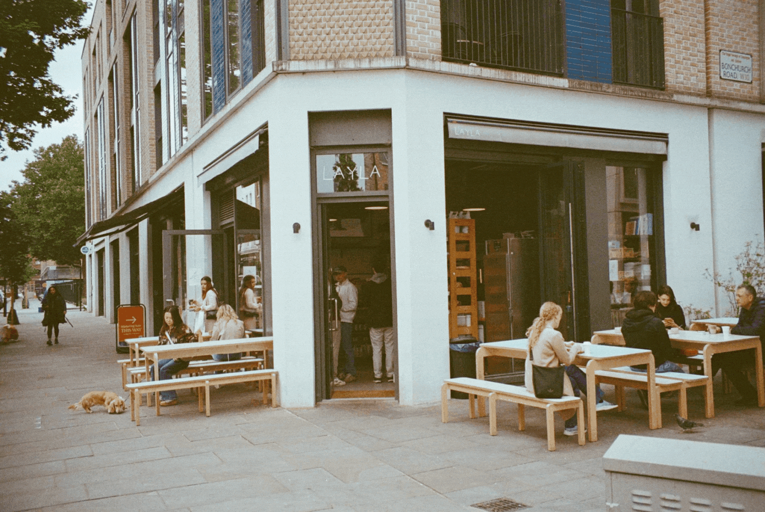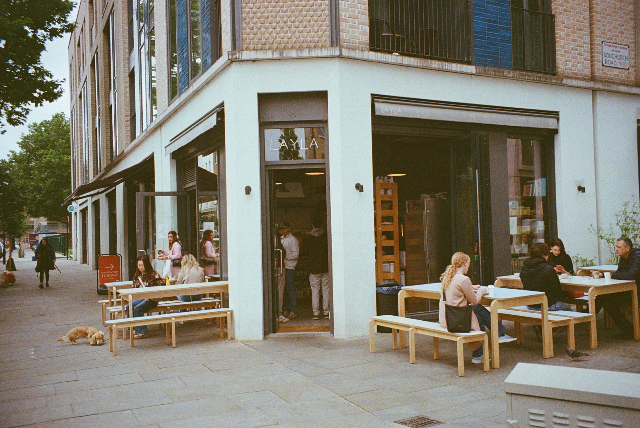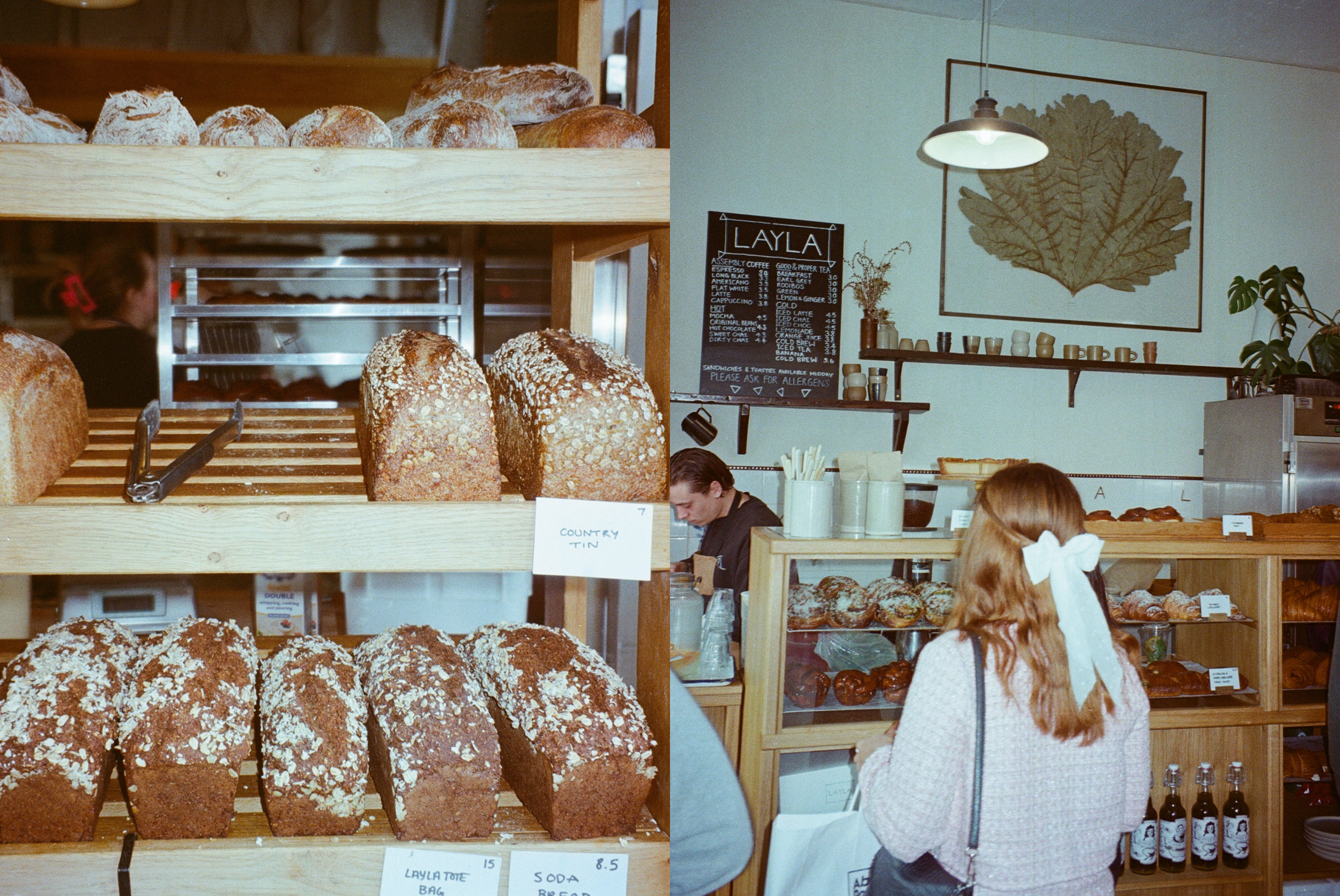 The bread shelves, pastry counter and outside tables & benches are all bespoke, designed and handmade for us by a carpenter based in Frome, Arn Design, using a beautiful European Oak. All of which have been tailored to meet our needs and to fit with our brand. We love our boucle striped cafe curtains, the fabric which comes from our neighbours on Portobello, The Cloth Shop. We have the most beautiful botanical picture that was given to us by a customer (House of Herbaria) who handmade the pressed gunnera leaf himself, which sits above the till at Layla and is one of the first things you're drawn to when entering the bakery. Our ceramics that we use everyday at the bakery are handmade for us by Lora Huws. Together we have designed a selection of plates and mugs to fit our menu of drinks and pastries.