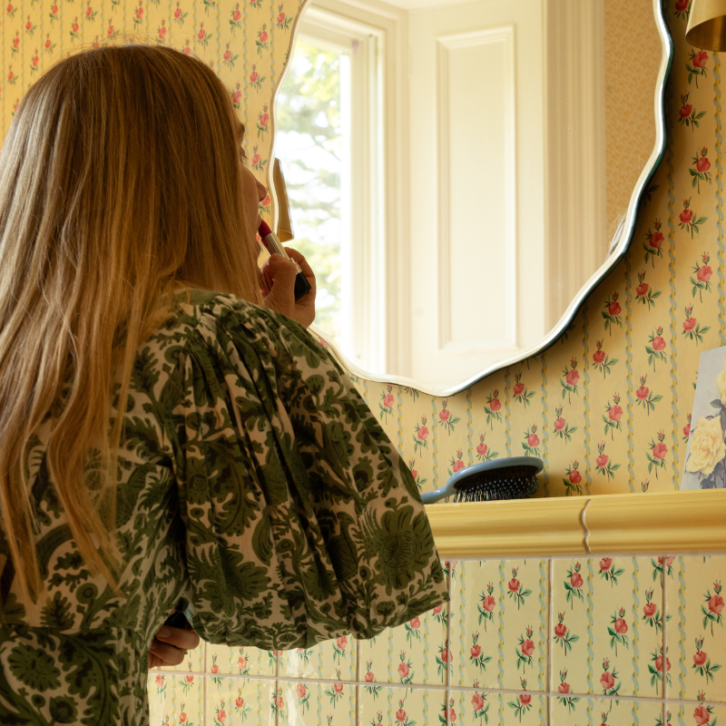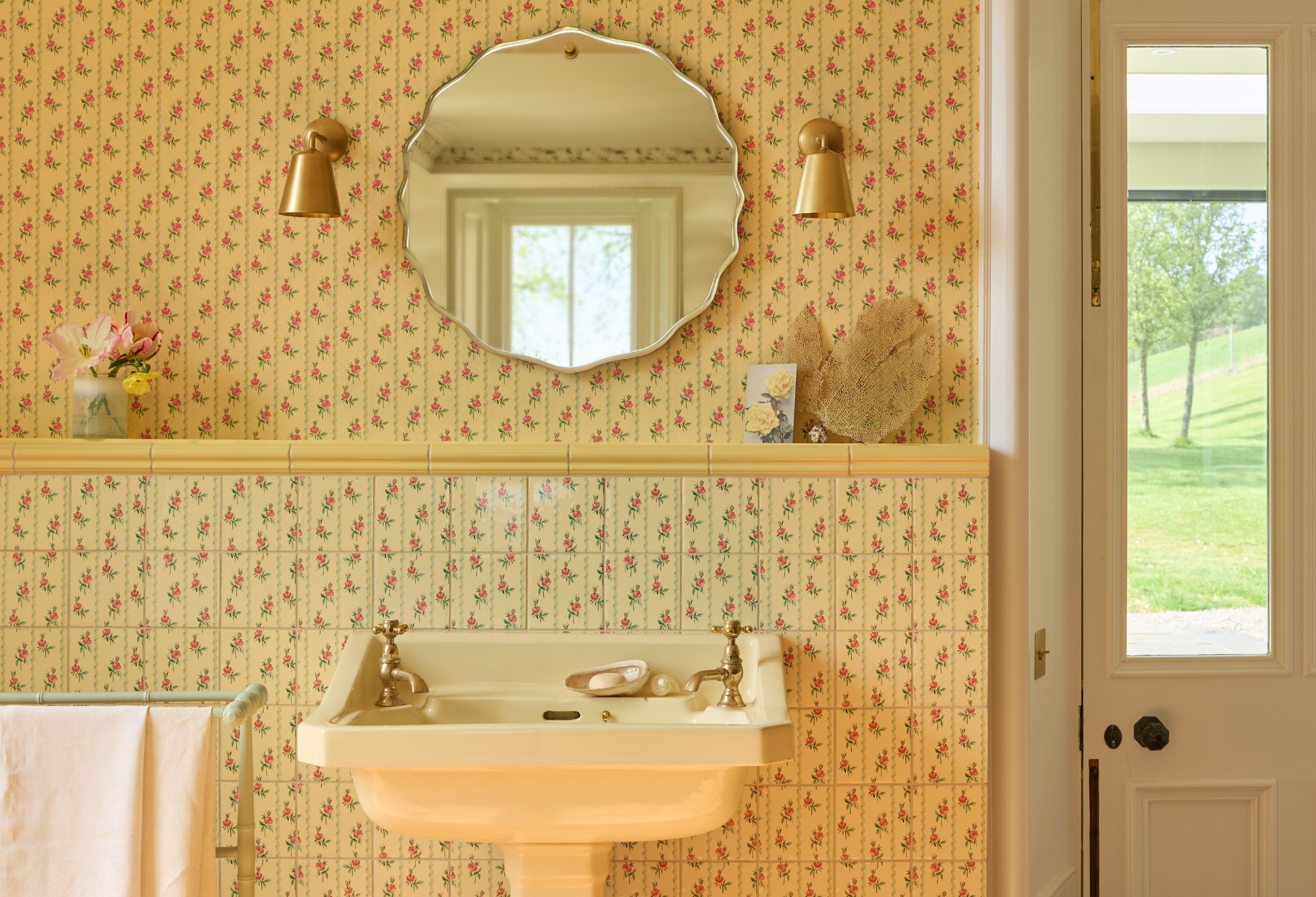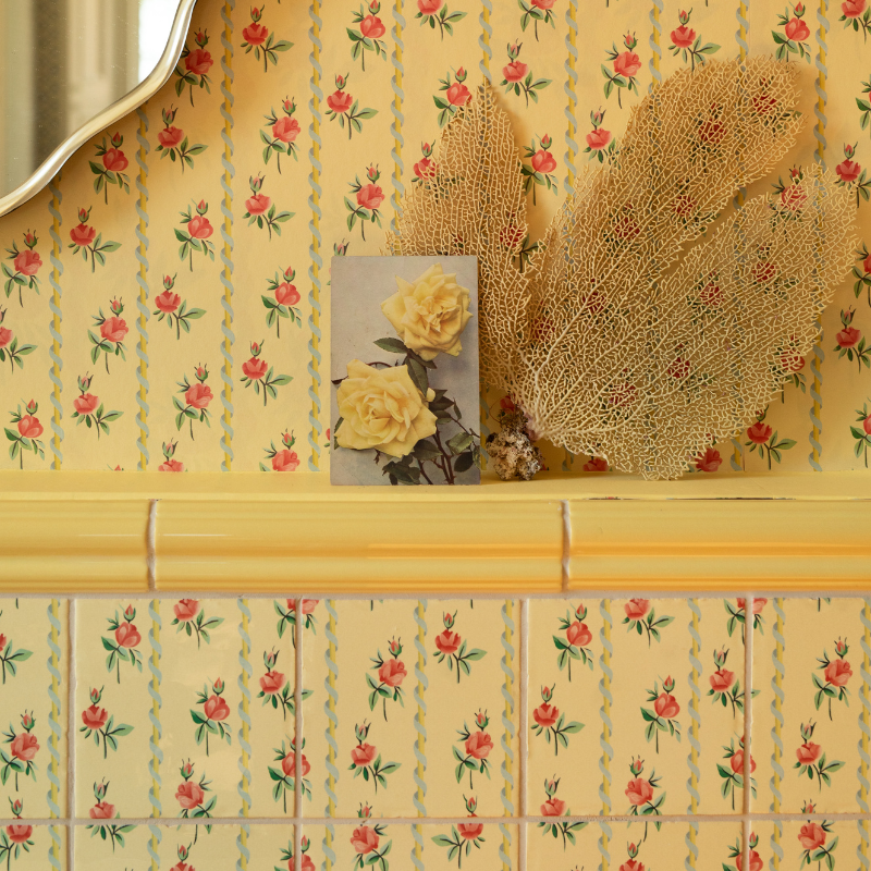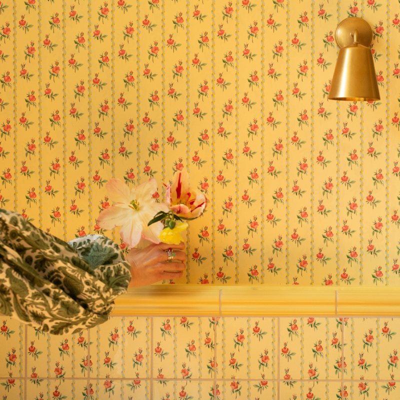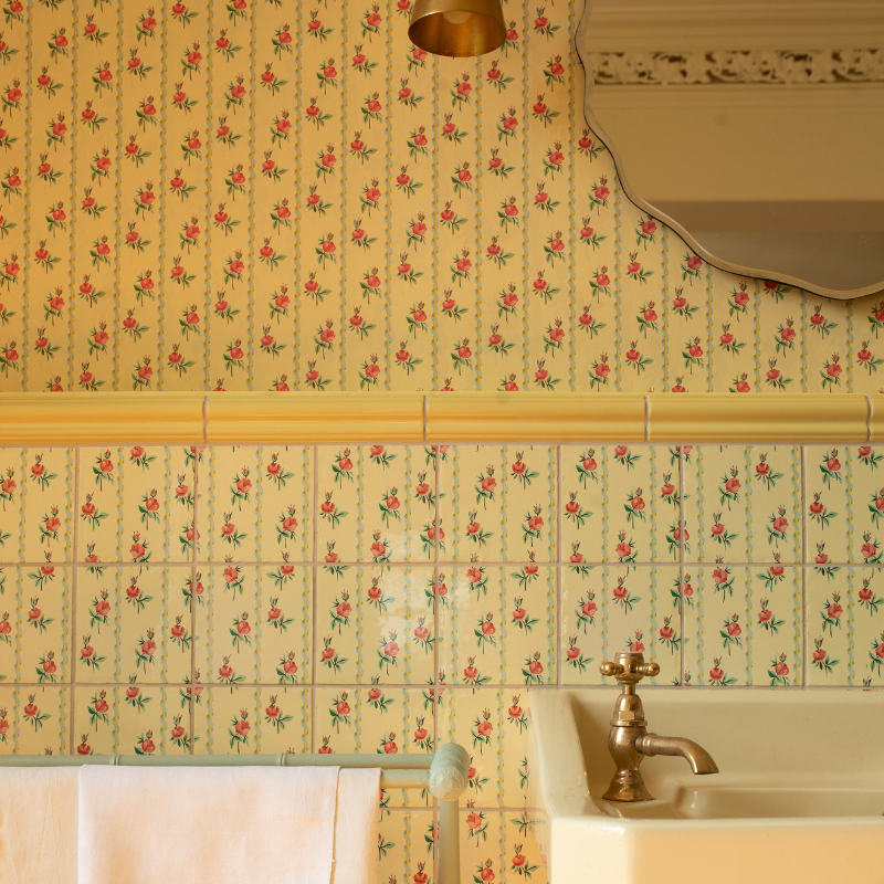 Drawing inspiration from the romantic interiors of Marie-Antoinette’s Petit Trianon, Poles & Roses reimagines the delicacy of 18th-century French design for the modern home. The pattern is graceful and light, with slender stripes and scattered roses creating a rhythm that feels feminine without being fussy, timeless yet refreshingly contemporary. Available in two scales — small for subtle charm, large for bold impact — it’s wonderfully versatile, working just as well in a bedroom or dining room or just like I’ve done here in our new bathroom using our buttery yellow Versailles II or hallways, or more dramatic settings.