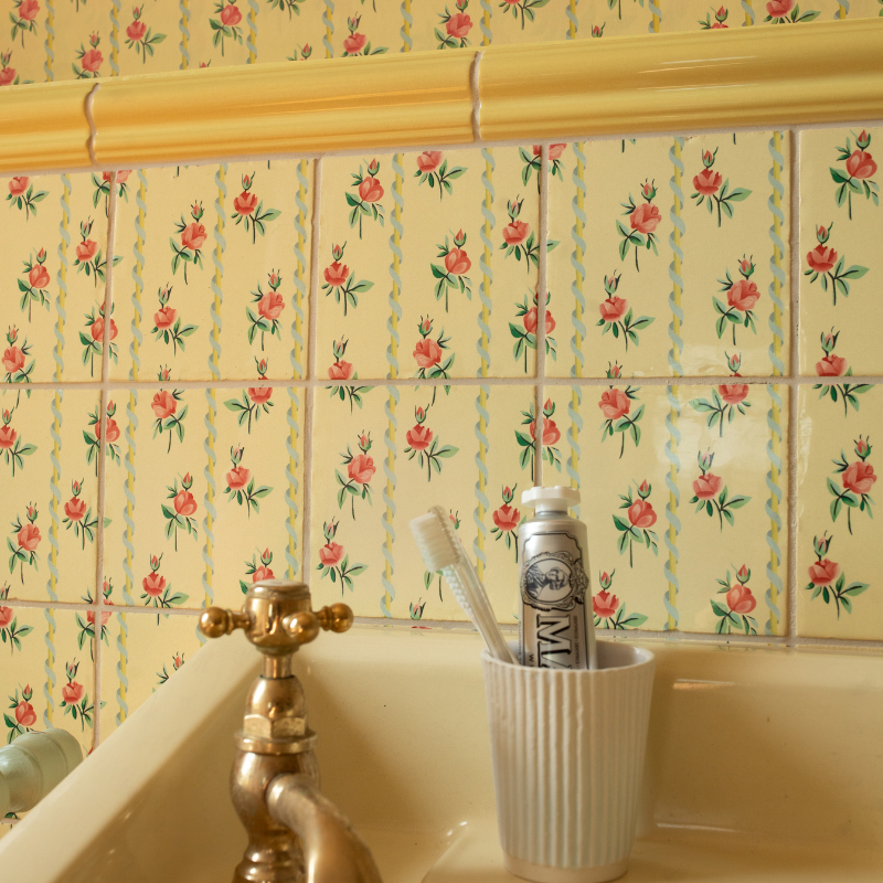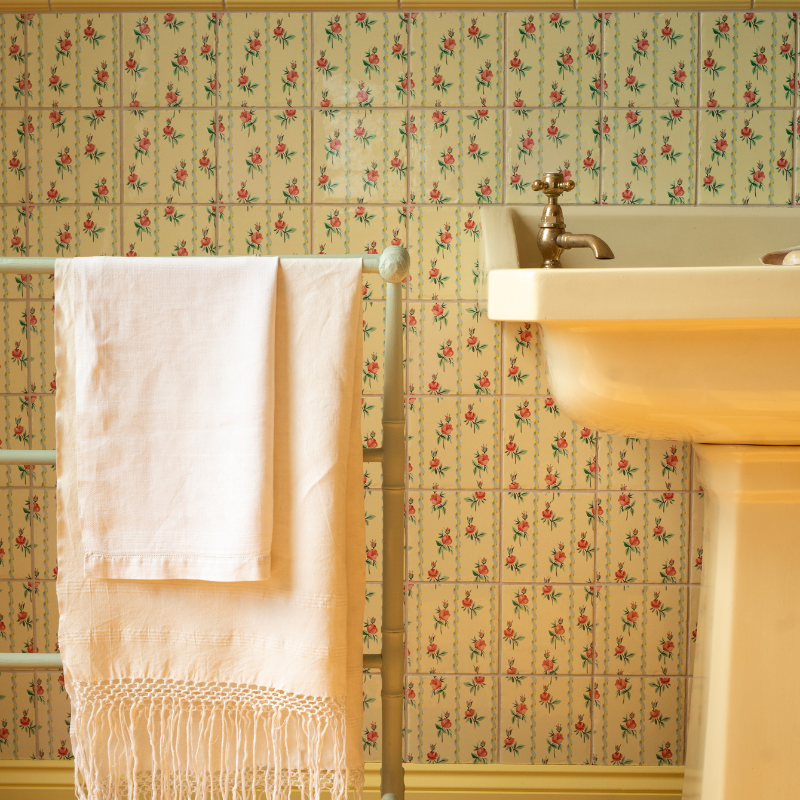 The wallpaper, along with its matching tiles and trims, pairs beautifully for a seamless floor-to-ceiling bathroom scheme, as I used here at home. I finished the look with a vanilla block dado along the edge of the shelf, giving the space a refined and considered touch. Available in 6 colour ways: Versailles, Courances, Tanlay, Fontainebleau, Chantilly and Chambord.