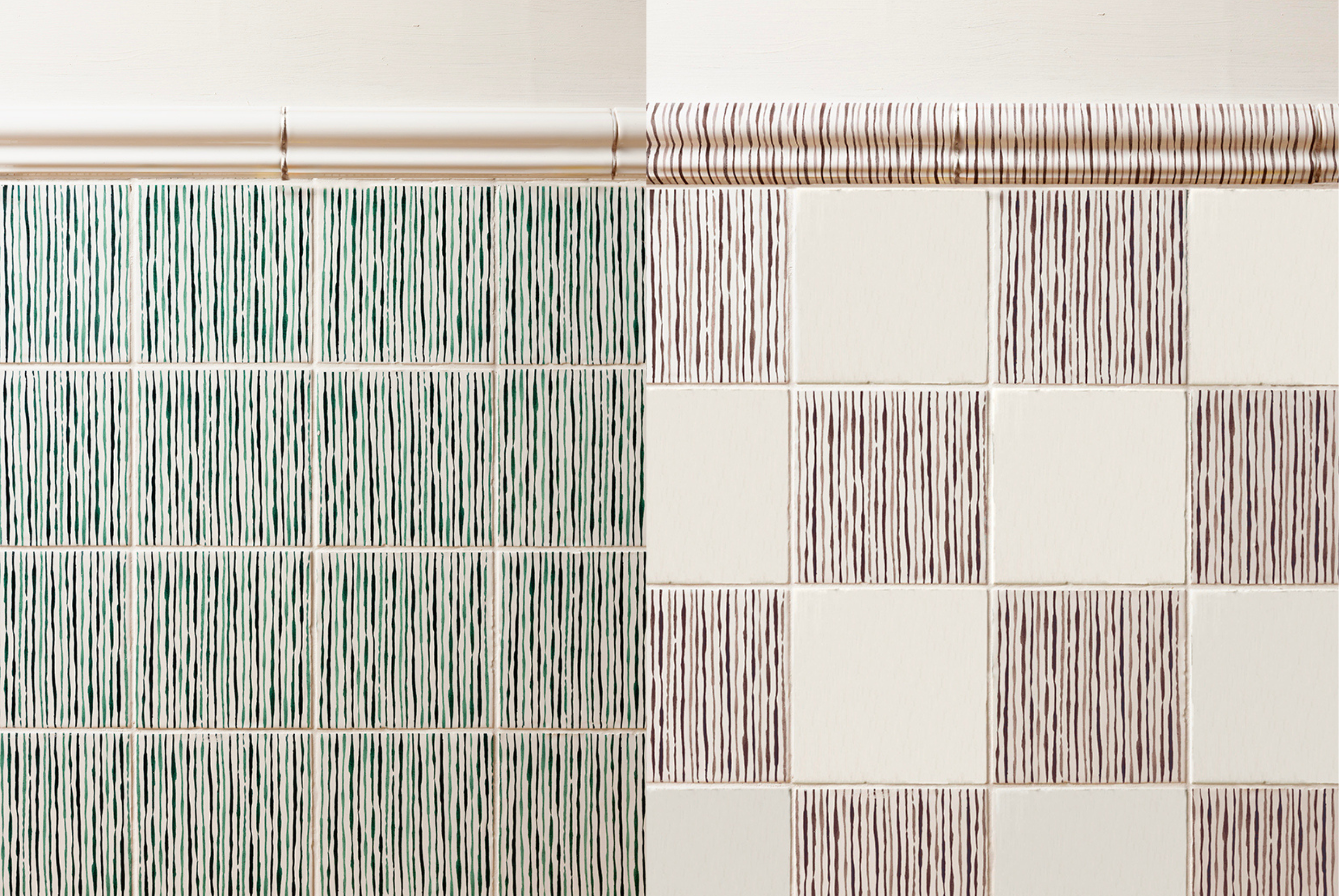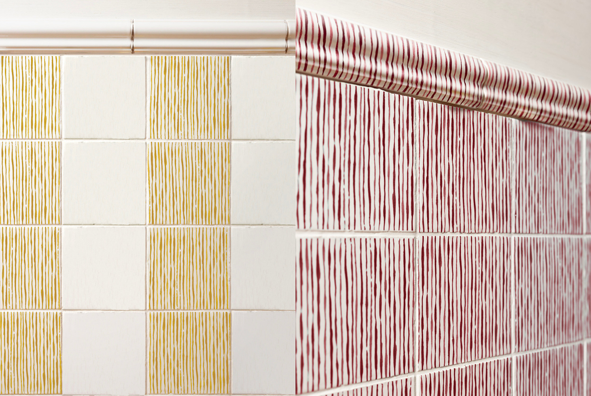 Our modern take on the classic Ticking Stripe adds a fresh twist with two-tone colours on tiles and dado trims. Its clean, linear design offers both traditional and timeless appeal. Available in blue, green, crimson, mustard, manganese and sepia.